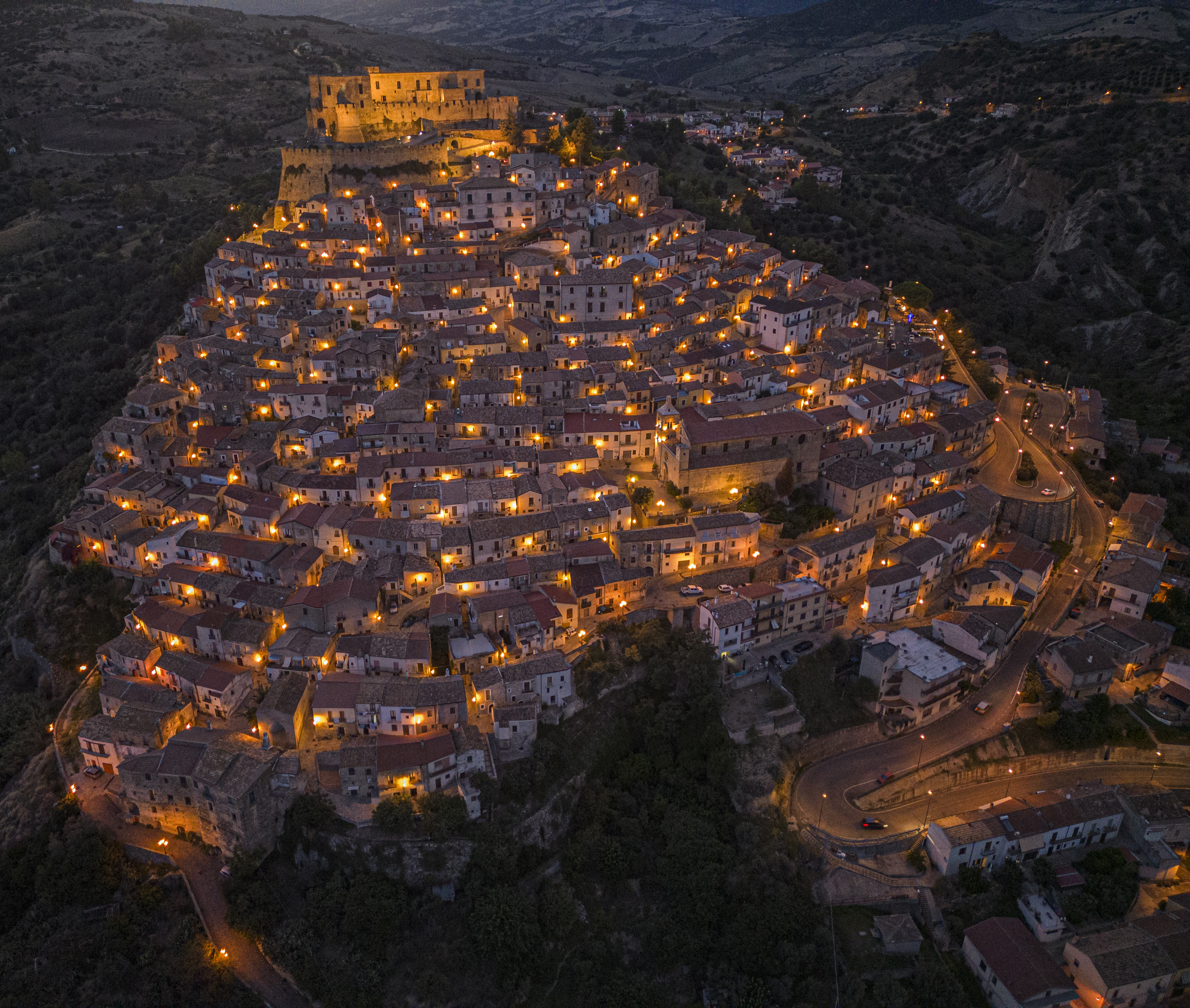 Tra la vegetazione compare il borgo di Trebisacce, balcone dello Ionio, con la sua chiesa di San Nicola di Mira